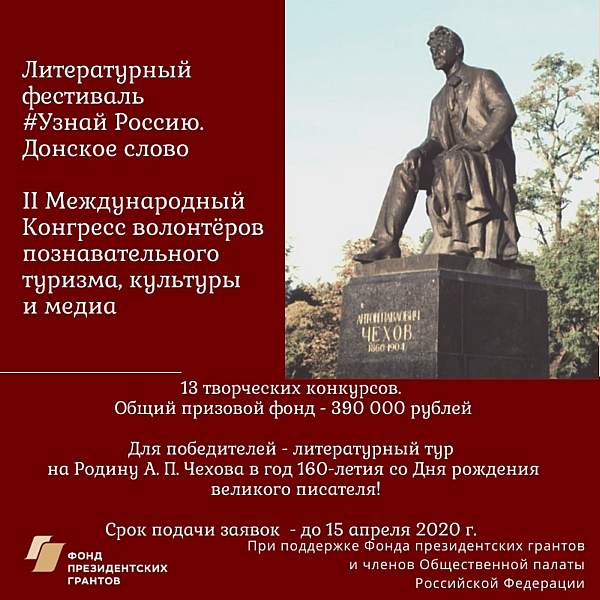 Волонтеры культуры, медиа и познавательного туризма — авторы лучших проектов по популяризации творчества великого писателя будут приглашены на родину писателя, в город Таганрог, и в другие города и районы Ростовской области.