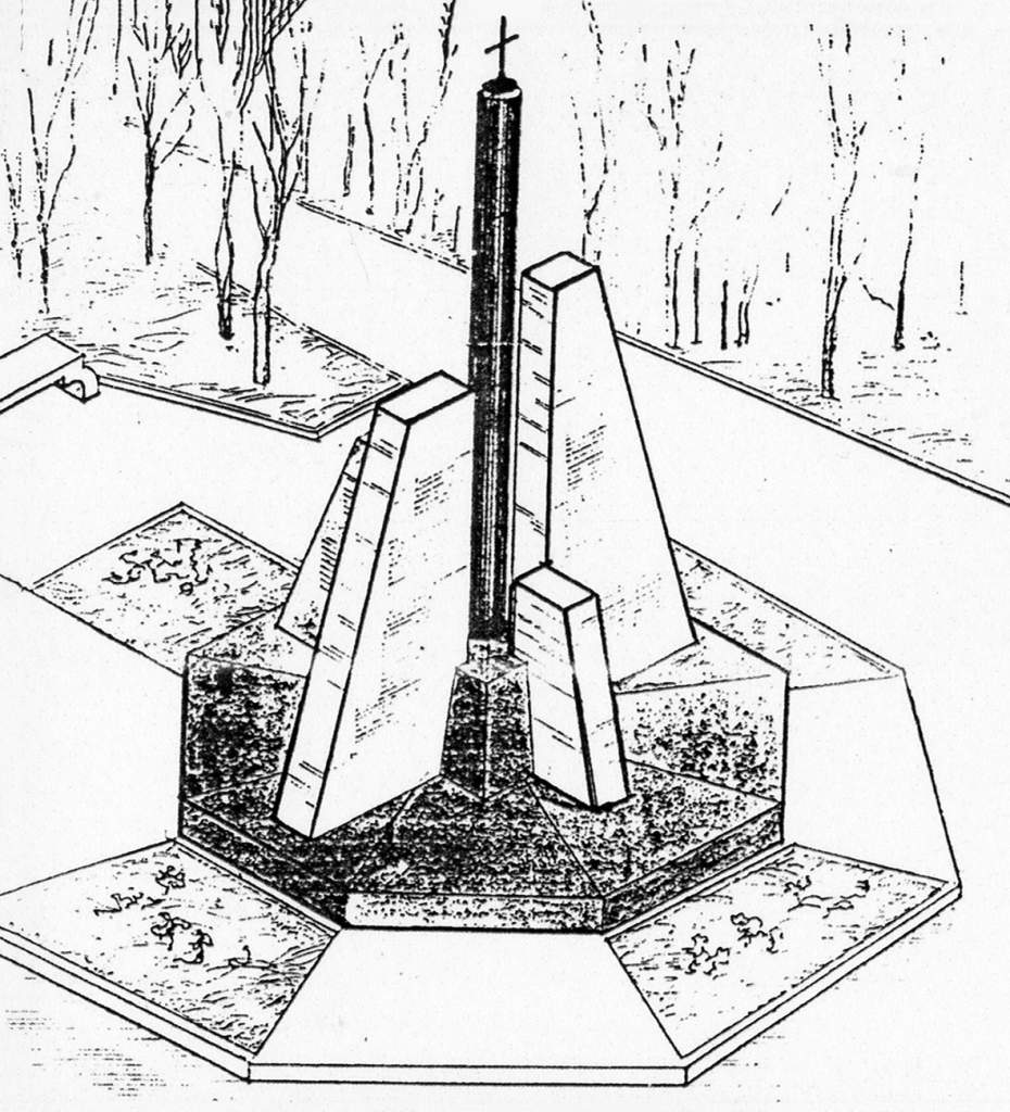 Памятный знак представляет композицию из 4-х стел и колонны с венчающим ее крестом. Стелы олицетворяют людскую силу и мужество, укротившие смертельный поток частиц атомного распада. Колонна – символ несущего смерть топливного сердечника атомного реактора.