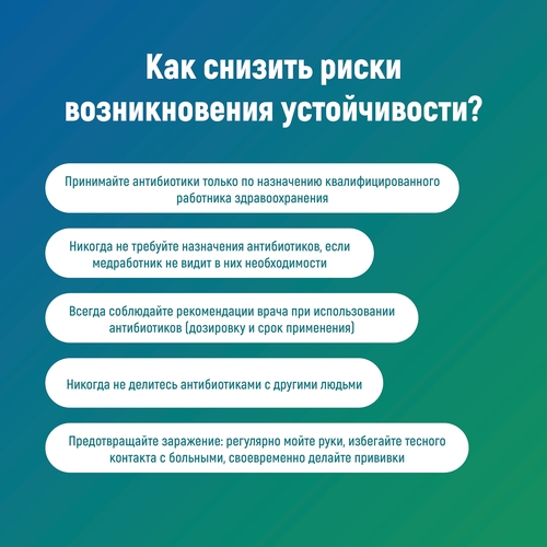 Решение проблемы устойчивости бактерий к антибиотикам – в руках человека. Полностью избавиться от этой проблемы, скорее всего, невозможно, но можно ее замедлить и даже сократить. Антибиотикорезистентность можно предупредить: