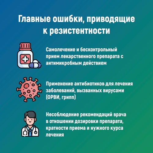 Многие факторы, способствующие появлению устойчивости к антибиотикам, связаны именно с неправильными действиями человека. Одна из основных причин появления антибиотикорезистентности — самолечение, когда пациенты самостоятельно назначают себе лекарственные препараты с антибактериальным действием.