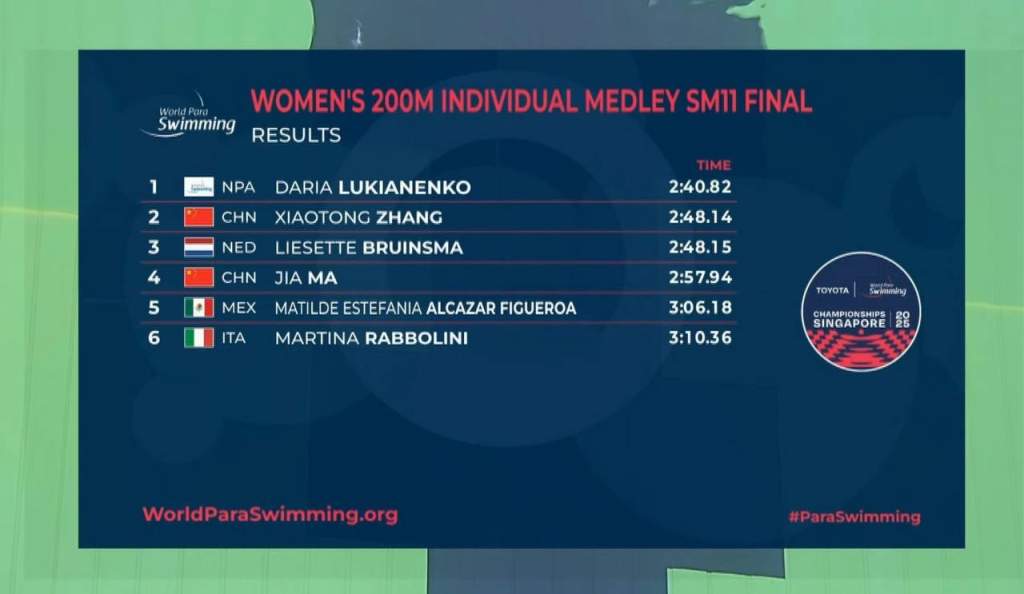Очередную, уже третью, медаль высшей пробы завоевала в Сингапуре наша звездочка Дарья Лукьяненко. Она была сильнейшей на дистанции 200 метров комплексным плаванием среди женщин в классе SM11. На этой дистанции Даша владеет рекордом мира, который установила на Паралимпиаде в Париже в прошлом году. Ее преимущество было безоговорочным, она выиграла у второго места более 7 секунд. А вот второе и третье места разделила одна сотая секунды (!).