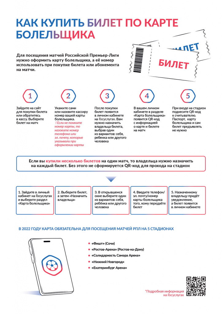 Билеты на матчи по-прежнему будут продаваться на сайтах футбольных клубов и в билетных кассах. При покупке нужно будет указать номер своей карты, номер телефона или адрес электронной почты, к которым она привязана. После покупки билета на Госуслугах автоматически сформируется QR-код. В коде будет зашита информации о билете и его владельце.