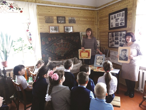 Елена Куркина и Надежда Емельянова во время познавательного часа «Живая история поколений» в музейной комнате клуба им. Л. Красина рассказывают учащимся школы №27 о Почетном гражданине города Шахты, жителе поселка им. Л. Красина – Е.Н. Кочеткове.