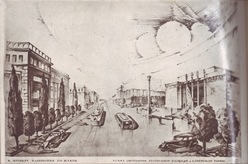 Вот так должна была выглядеть улица Советская. В перспективе виден памятник Ленину, обращенный к проспекту Победа Революции. Он должен быть на центральной площади, рядом с Домом Советов. По периметру площади идут Дом кооперации и госторговли, Дом кредитных учреждений, гостиница, Дом Союзов, Дом техники и обороны, городская библиотека.