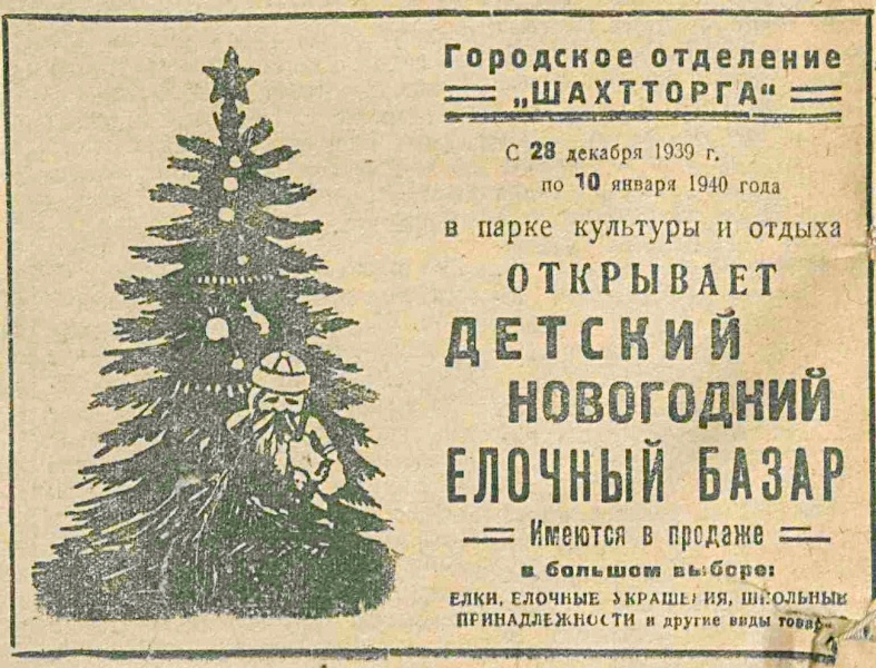 Так, первая из них представляет собой объявление об открытии в городском парке детского новогоднего елочного базара в 1940 году. Оно было опубликовано в газете «Красный шахтер» №2 от 3 января 1940 года. Интересно, что елочный базар открылся 28 декабря 1939 года и продолжался до 10 января нового, 1940 года. Как гласит объявление, в продаже были не только елки, но и новогодние игрушки, школьные принадлежности и другие товары.