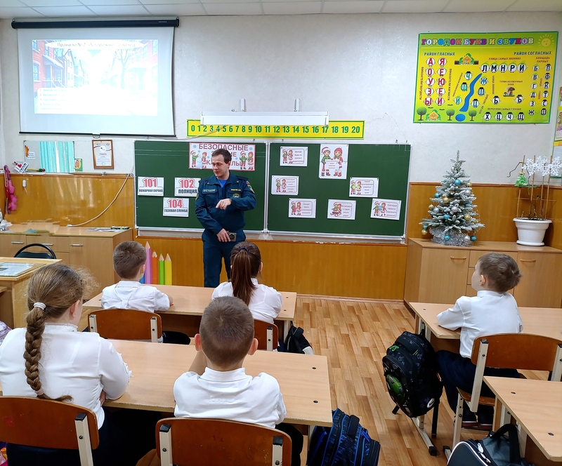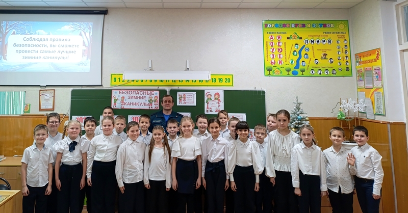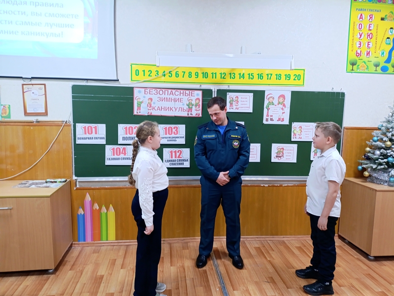 К ребятам пришёл гость — Даниил Алексеевич, сотрудник МЧС, который рассказал, как сделать зимние каникулы по‑настоящему незабываемыми, но при этом безопасными.
