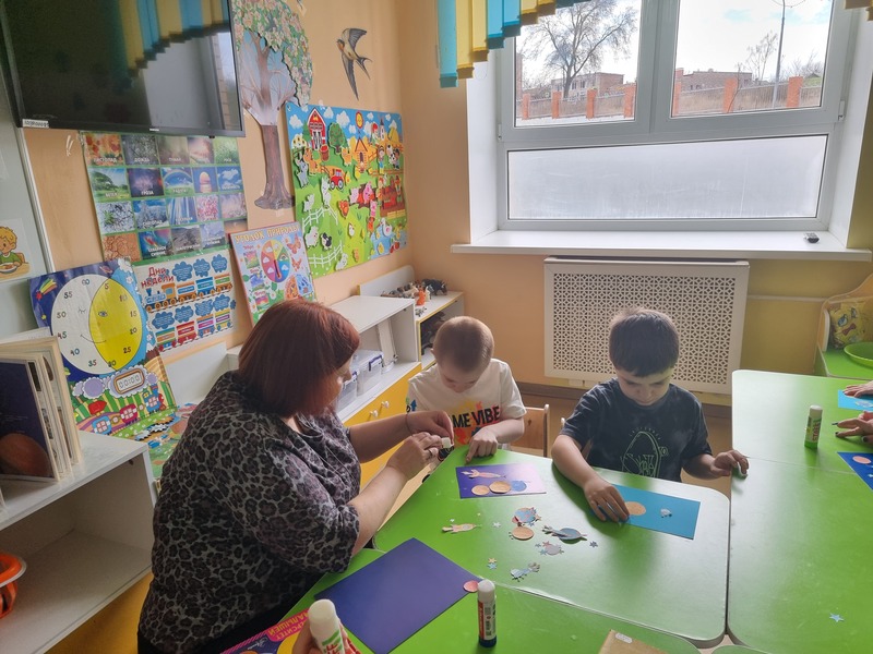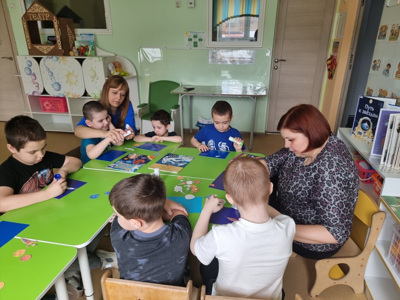 Встреча началась с короткой познавательной беседы о космосе и первом космонавте Юрии Гагарине. Рассказ сопровождался показом больших красочных иллюстраций из книг о космонавтике. Затем ребята сделали аппликацию «Космические фантазии», в состав которой вошли: ракета, звёзды, Луна, кометы и планеты.