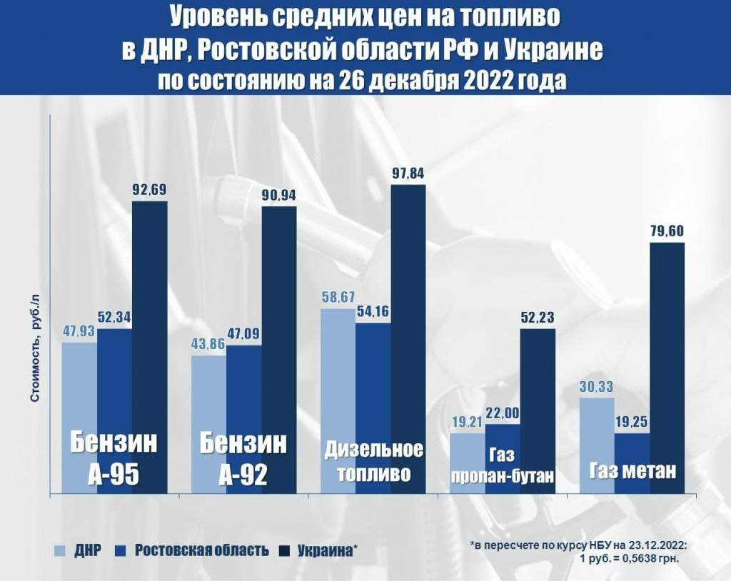 По состоянию на 26 декабря 2022 года, уровень средних цен на топливо в ДНР и соседней с ней Ростовской области оказался заметно ниже, чем на Украине. Так, ростовские автовладельцы платят за бензин А-92 примерно 47 рублей за литр, в то время как украинцы отдают почти 98 рублей (пересчитано по курсу гривны за вчерашнее число).