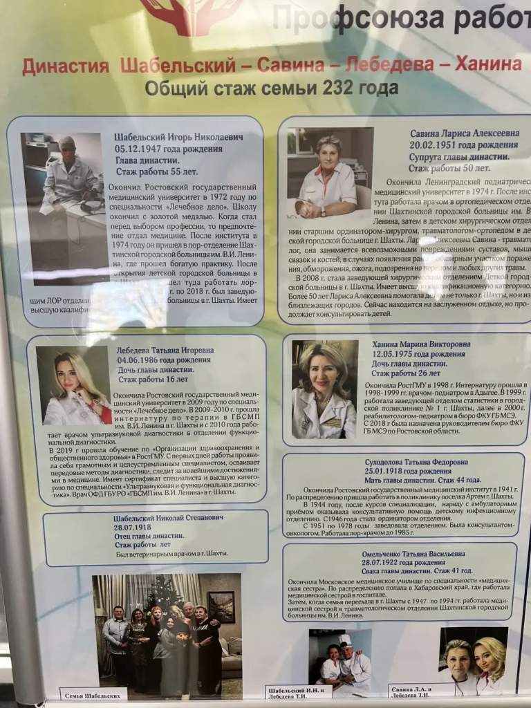 ГБСМП имени Ленина города Шахты представляет трудовая династия Шабельских-Савина-Ханина, стаж работы представителей которой составляет более 380 лет.
