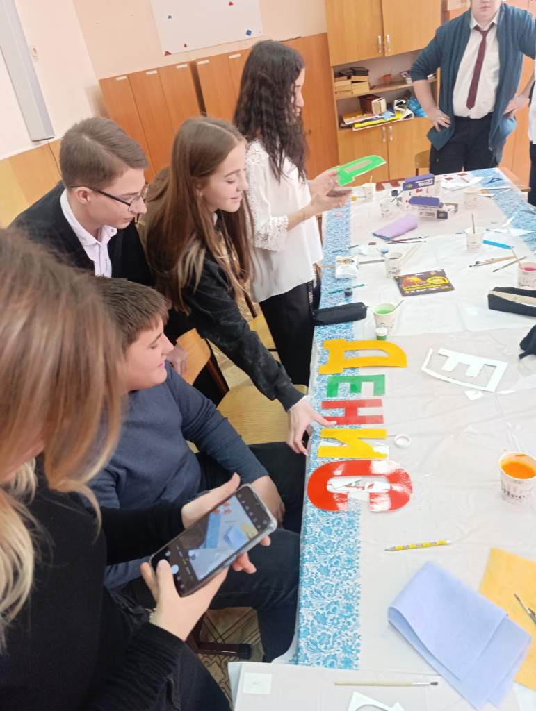 Практическая часть мероприятия стала настоящим испытанием для командного духа и креативности. Участникам предложили создать поздравительную надпись ко Дню рождения школы. Каждый школьник получил задание оформить отдельную букву, а затем все элементы объединили в единую композицию.