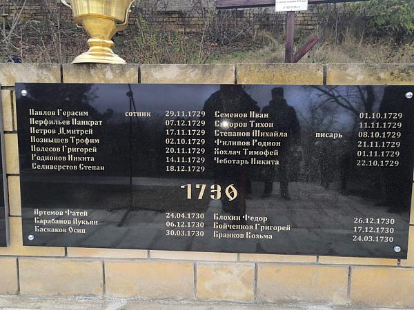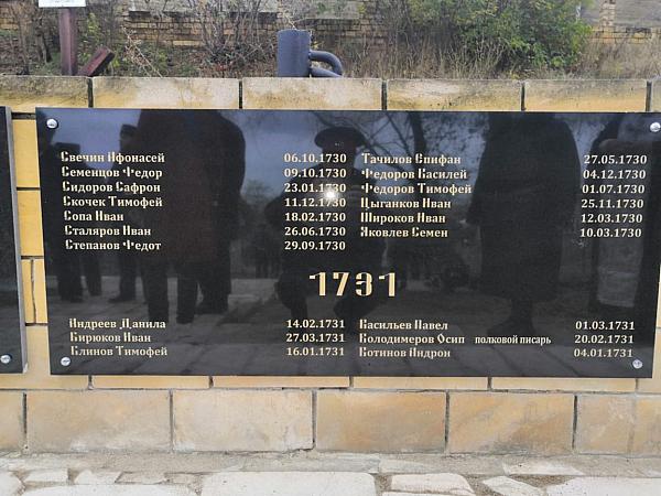Память о вкладе донских казаков в укрепление государственности жива и за пределами нашего региона. В г. Дербенте (Дагестан) в ноябре прошлого года открылась мемориальная доска с именами 114 казаков времен Петра I. Их останки были найдены в ходе археологических раскопок на территории местной воинской части. О том, что останки принадлежат воинам Дербентского гарнизона Низового полка русской императорской армии, стало известно, благодаря найденным в Государственном военно-историческом архиве документам. Они подтвердили личности казаков, скончавшихся в свое время от ран и болезней. Прах перезахоронили на воинском кладбище Дербента.