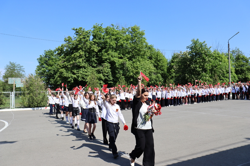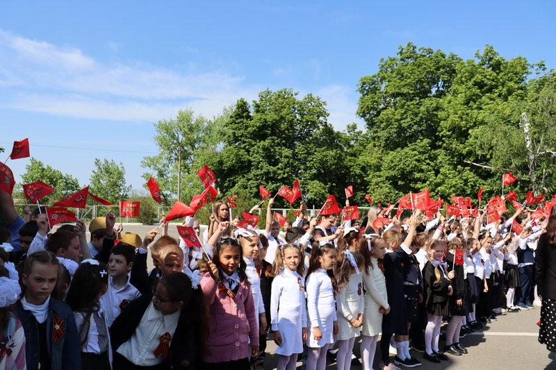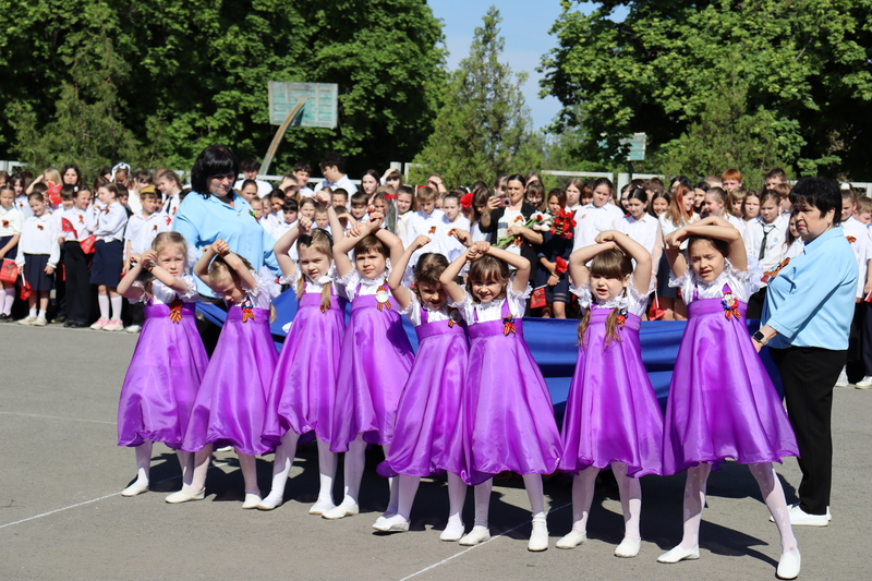 С творческими номерами выступили ученики школы №14, а в завершение устроили флешмоб, выстроившись в форме цифры 80 на школьной площади.