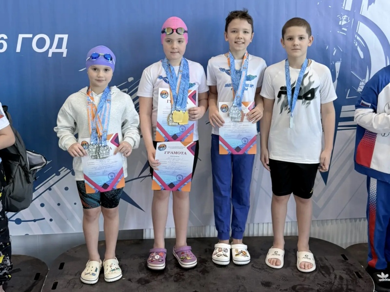 Смешанная эстафета 4Х50 м комплексным плаванием (10 лет и младше) слева направо: Анастасия Свиридова, Елизавета Григорчук, Архип Куляс и Дмитрий Марченко