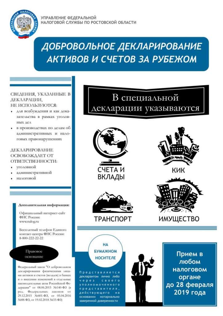Также ФНС России подготовила информационную брошюру (https://www.nalog.ru/rn77/about_fts/brochure/), в которой в доступной форме изложены особенности уплаты налогов в Российской Федерации при ведении бизнеса за границей или при наличии зарубежных активов, объясняется, как избежать двойного налогообложения, какая информация подлежит раскрытию, а также многие другие вопросы декларирования зарубежных активов и счетов.