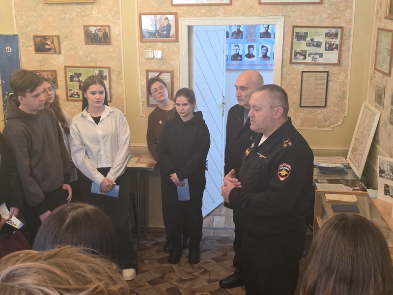 В музее истории органов внутренних дел и внутренних войск правоохранитель рассказал аудитории об основных задачах и направлениях оперативно-служебной деятельности сотрудников органов внутренних дел, условиях поступления на службу, требованиях к прохождению медицинской комиссии, сроках и условиях стажировки и первоначальной подготовки, предусмотренных для вновь принятых сотрудников. Кроме того, он проинформировал учащихся о возможности бесплатного получения профессионального высшего образования в ведомственных вузах и перспективах карьерного роста.