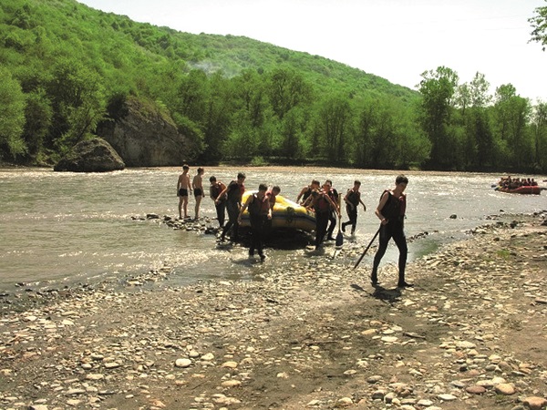 Сплав по горной речке на надувных плотах.