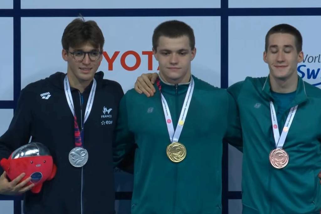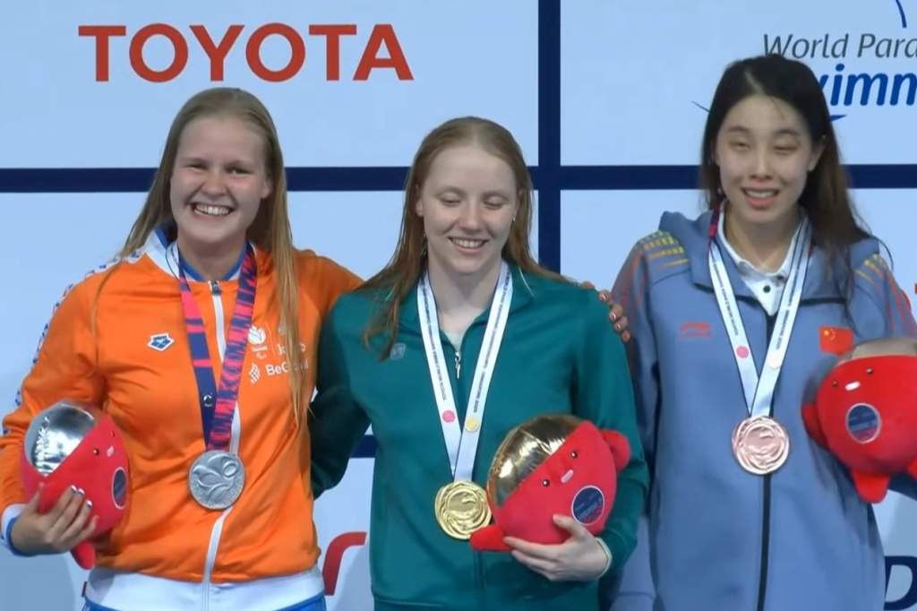 Награждение Егора Щитковского после победы на чемпионате мира по паралимпийскому плаванию на дистанции 400 метров вольным стилем, класс S13