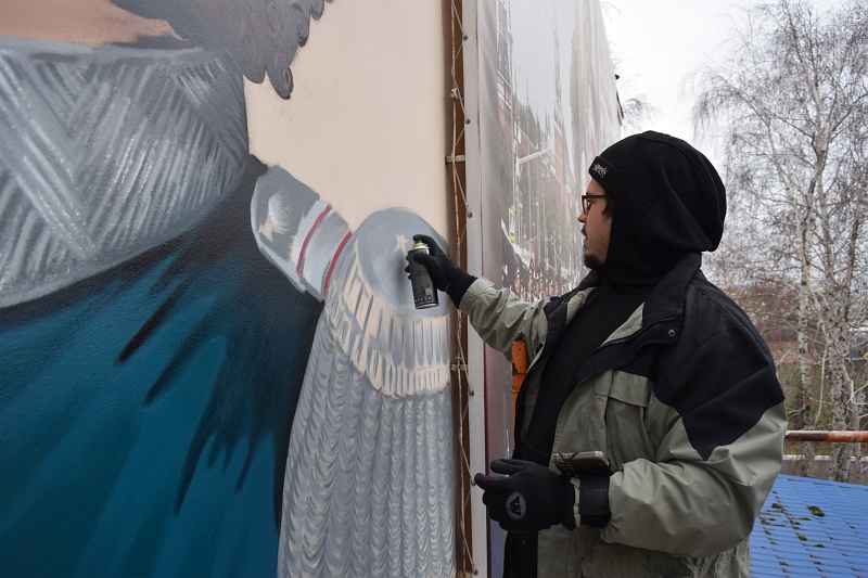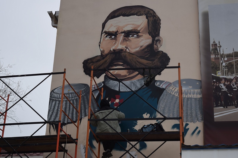 – Я, признаться, работу не сильно быстро выполняю. Стараюсь делать ее качественно. Хочу выполнить их в более живописной манере. Здесь уже в сам кадетский корпус входишь как в музей. Поэтому рука не поднимается схалтурить. Этот мурал у меня займет неделю. Со следующим тоже ориентируюсь на этот же срок. Возможно, сделаю чуть быстрее. Там нет таких сложных элементов, как эполеты. Я их сегодня делал целый день. Можете обратить внимание, насколько прорисованы усы. Следующий рисунок чуть проще.