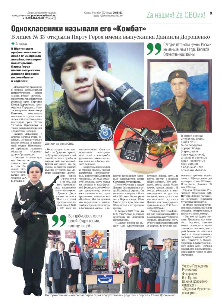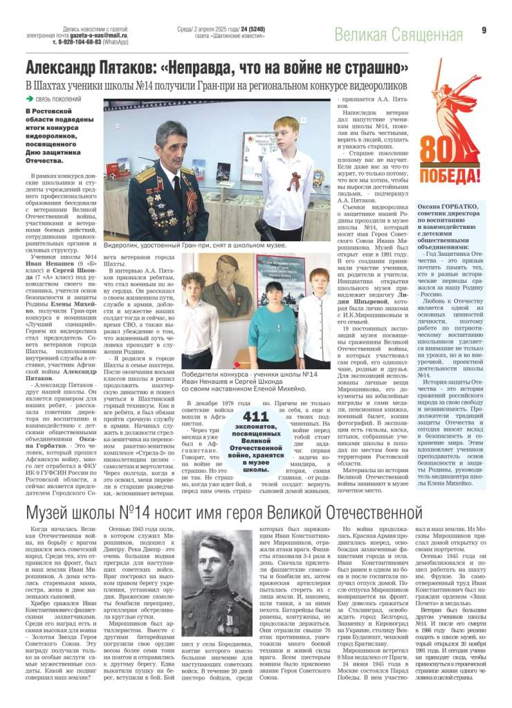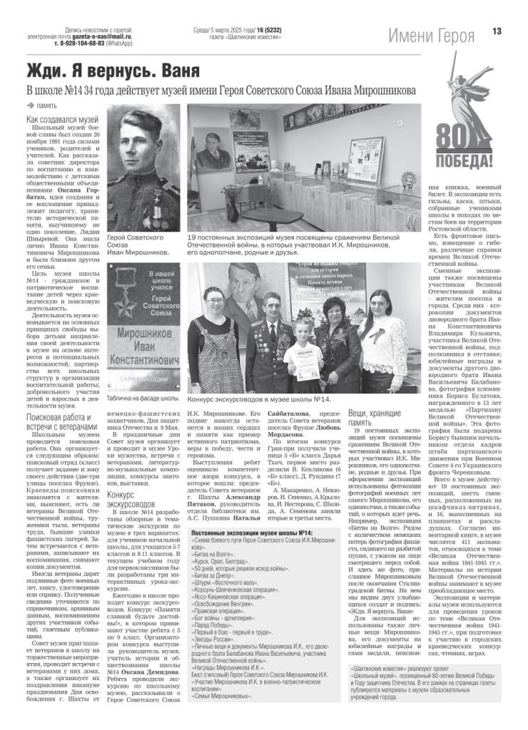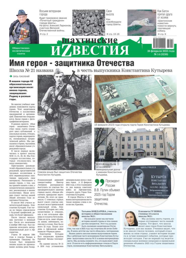Большинство школ города Шахты носят имена героев Великой Отечественной войны, локальных войн. Газета “Шахтинские известия” реализует посвященный им проект “Имя героя”, рассказывая на своих страницах об их судьбах. Особое внимание – участникам СВО.