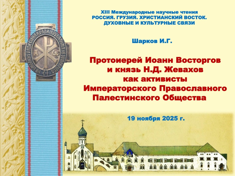 В утреннем заседании первого дня форума с докладом «Протоиерей Иоанн Восторгов и князь Н.Д. Жевахов как активисты Императорского Православного Палестинского Общества» выступил старший преподаватель Института сферы обслуживания и предпринимательства (филиала) ДГТУ в г. Шахты, древлехранитель Шахтинской епархии, член Совета Ростовского отделения Императорского Православного Палестинского Общества Илья Геннадиевич Шарков. Доклад был подготовлен в рамках реализации Программы фундаментальных научных исследований ИППО – Минобрнауки РФ по направлению «Россия и Ближний Восток: исторические, археологические и культурные контакты и связи», проект «Социокультурная, просветительская и паломническая деятельность западнорусских отделов Императорского Православного Палестинского Общества в конце XIX – начале XX вв.». В своём выступлении Илья Геннадиевич отметил, что ключевые персоналии, которым посвящён доклад, связывает беззаветное служение России, членство и активное участие в деятельности Императорского Православного Палестинского Общества, патриотизм и монархические убеждения. Грузия в их судьбах также сыграла немаловажную роль: князь Николай Давидович Жевахов по отцовской линии принадлежал к русской ветви грузинского княжеского рода Джавахишвили, а протоиерей Иоанн Иоаннович Восторгов в 1897–1905 годах служил в Тифлисе. Также двух выдающихся общественных активистов объединяло создание в 1910–1913 годах русского храма и подворья ИППО в итальянском городе Бари, где с XI века почивают святые и многоцелебные мощи великого угодника Божия и чудотворца Николая, архиепископа Мир-Ликийского.