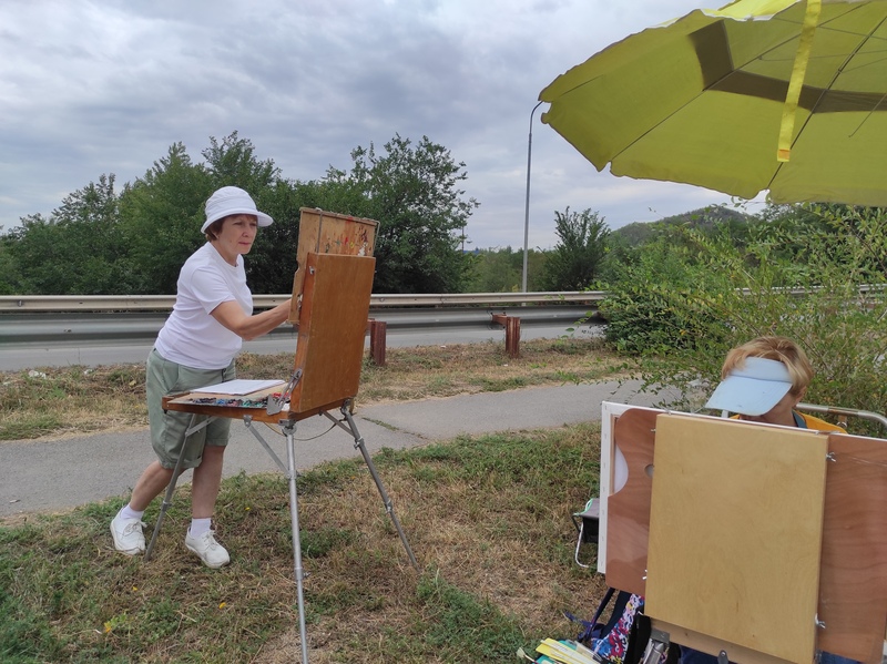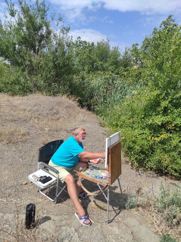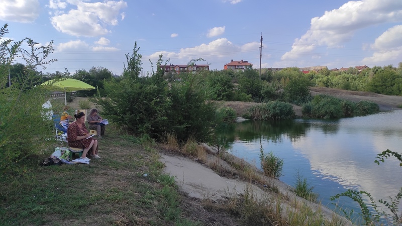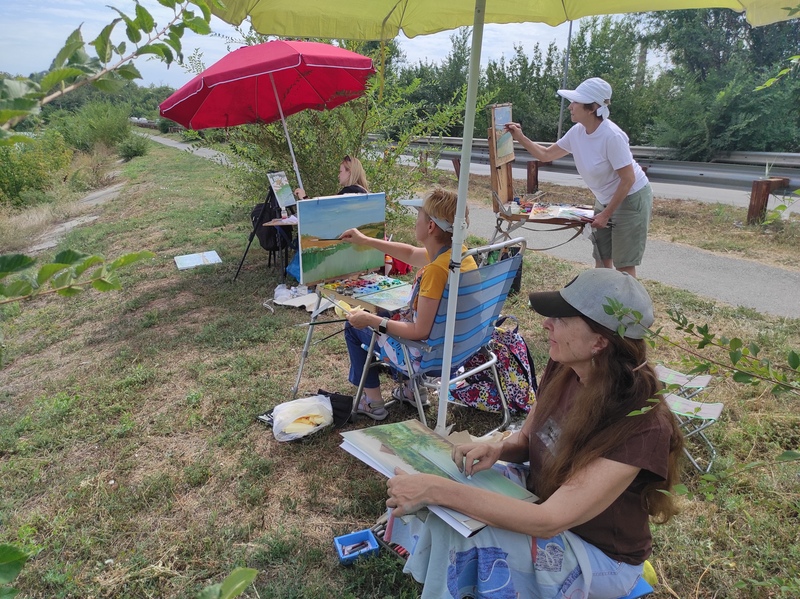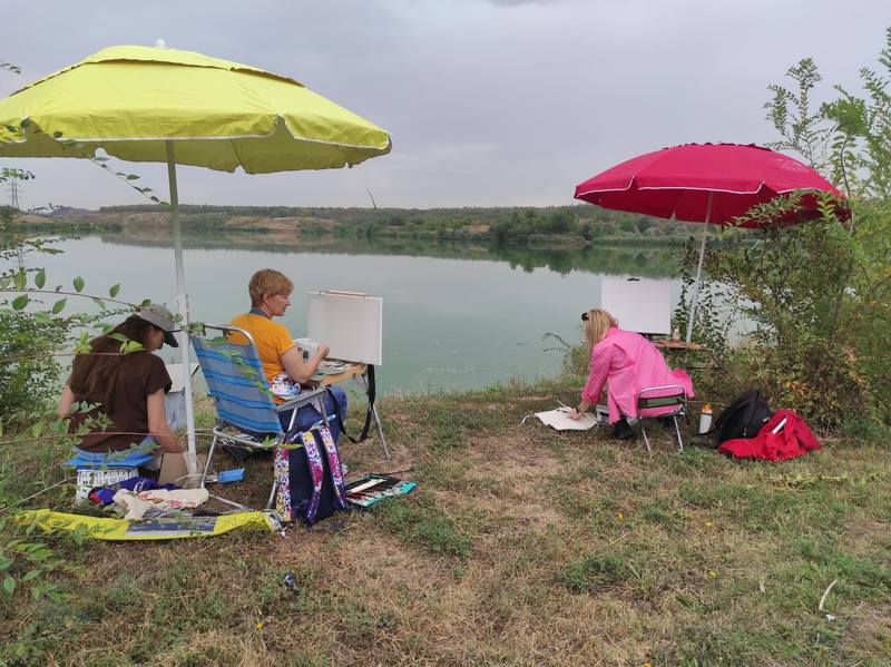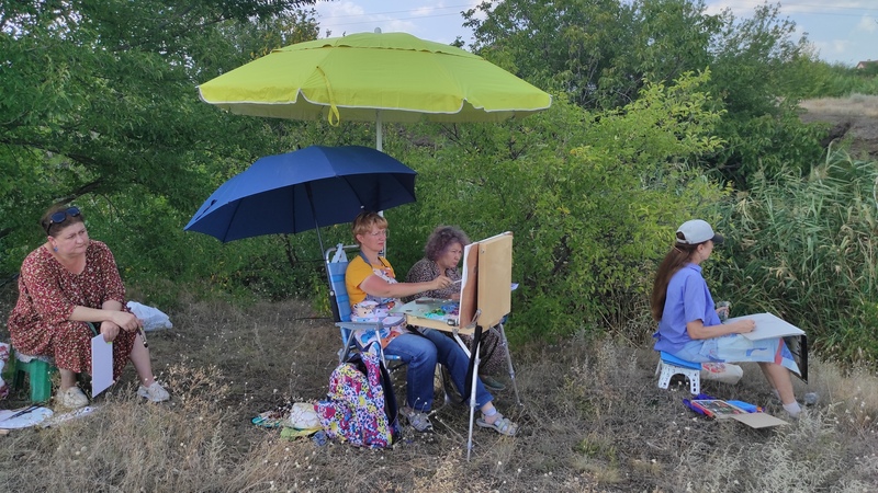 Утренний выезд начался в атмосфере настоящей южной природы: после небольшого дождя воздух наполнился свежестью, а низкие облака создавали идеальные условия для живописи. Художники расположились на дамбе ХБК, где их работа привлекла внимание проезжающих автомобилистов.