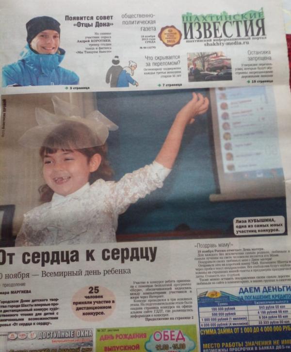 – Лиза стала участвовать в конкурсах, получать награды, ей это начало нравиться, – продолжила рассказ Алла. – А фото с дистанционного конкурса для детей с ОВЗ «От сердца к сердцу» даже украсило обложку одного из выпусков газеты «Шахтинские известия» в 2015 году. Для нас это большая радость, мы до сих пор храним этот выпуск. Сейчас Лиза посещает Автономную некоммерческую организацию содействия социальной адаптации детей-инвалидов «Мир один для всех». Любит выступать на сцене. Общительная, очень добрая по отношению к другим, никогда не откажет в помощи, последнее отдаст, любит делать добрые дела. Мечтает открыть приют для животных.