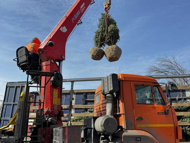 Во время высадки елей в Александровском парке использовалась спецтехника. Деревья бережно выгрузили и поместили в грунт.