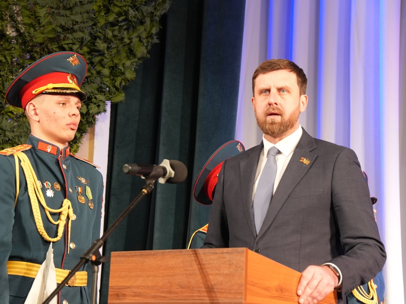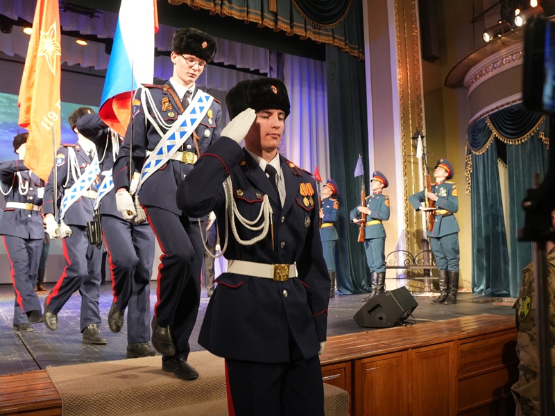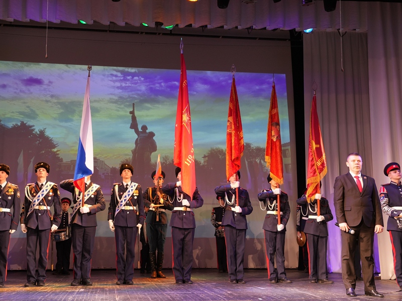 Воспитанники казачьего кадетского корпуса имени генерала Я.П. Бакланова внесли Государственный флаг Российской Федерации, копию знамен Победы и дивизий, освобождавших город: 40-й гвардейской Енакиево-Дунайской Краснознаменной ордена Суворова; 258-й стрелковой и 315-й Мелитопольской.