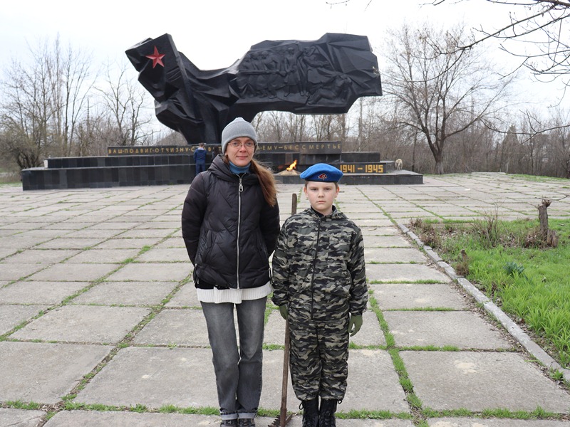 Юрий Мошаров – юнармеец отряда «Стрижи» пришел на уборку Аютинского мемориала вместе со своей мамой Светланой. Они рассказали «Шахтинским известиям», что они второй год подряд принимают участие в патриотической акции «Дон помнит» и наводить порядок на мемориалах.