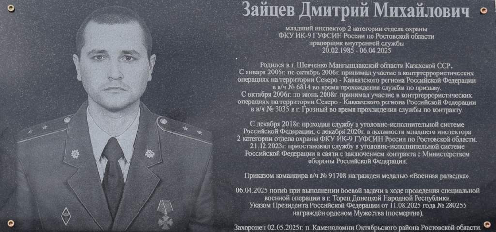 В ФКУ ИК-9 ГУФСИН России по Ростовской области состоялось знаковое событие – открытие мемориальной доски героя СВО Дмитрия Михайловича Зайцева, погибшего при исполнении воинского долга в ходе специальной военной операции. Ранее Д.М. Зайцев проходил службу по контракту в уголовно-исполнительной системе, служил в должности младшего инспектора отдела охраны ФКУ ИК-9 ГУФСИН России по Ростовской области.