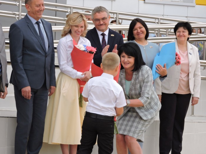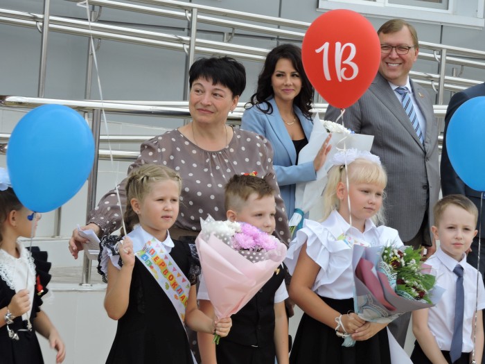 После театрализованного выступления обучающихся школы наступил торжественный момент перерезания красной ленточки, которую провели А.В. Ищенко с первоклассниками, затем прозвенел символический звонок.