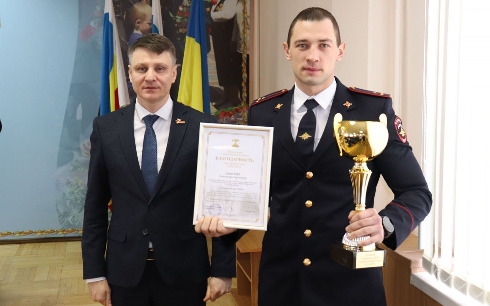 Переходящим кубком «Лучший сотруднику ДПС и Благодарностью» – старшего инспектора отдельного взвода дорожно-патрульной службы ГИБДД УМВД России по городу Шахты старшего лейтенанта полиции Соколова Александра Сергеевича;
