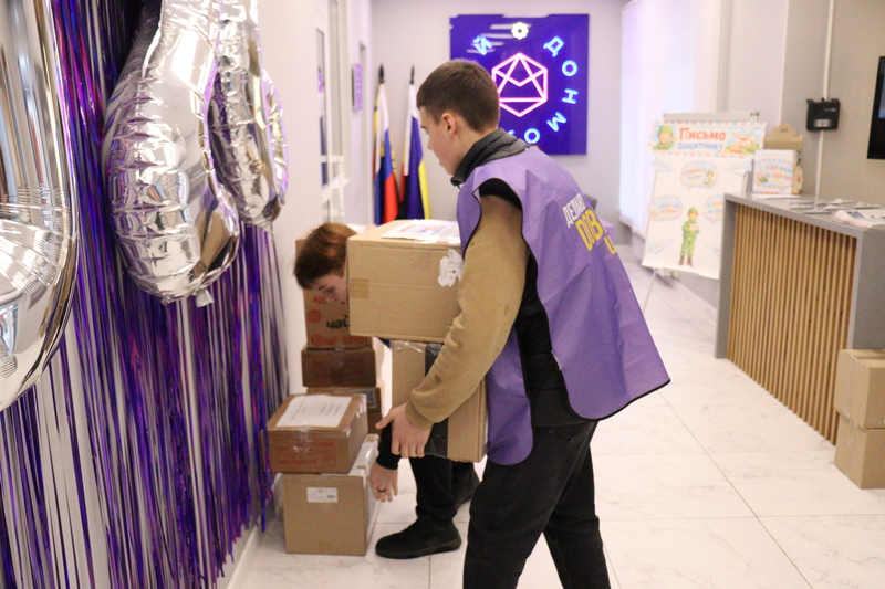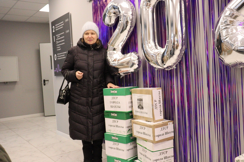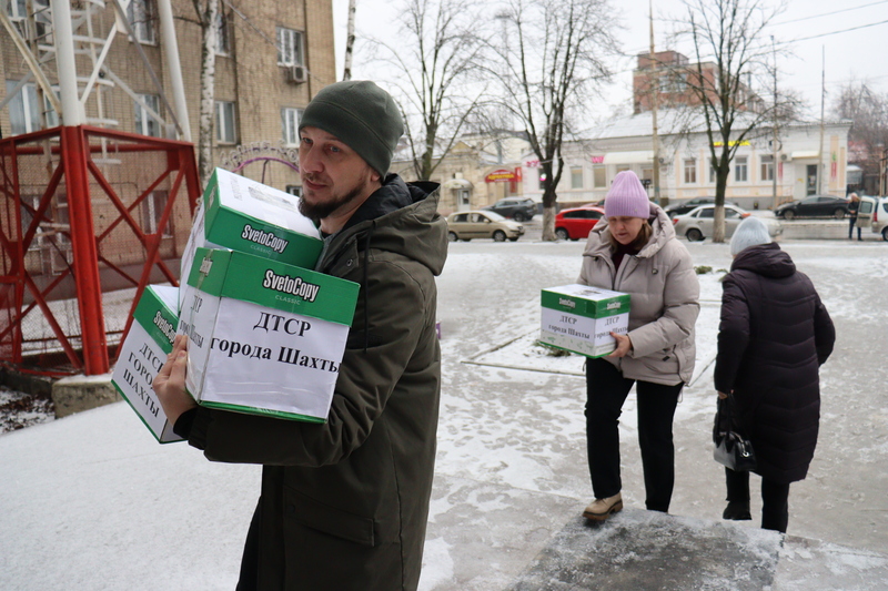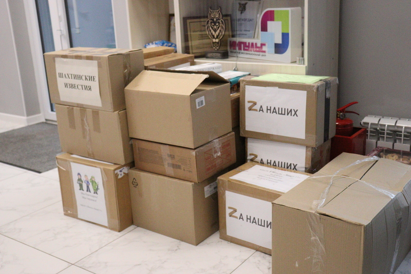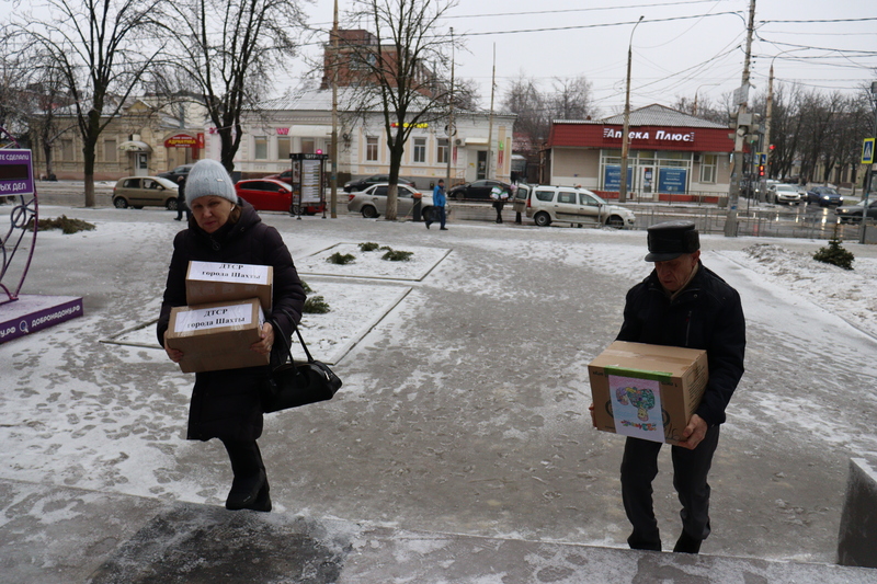 Шахтинцы принесли коробки с продуктами, лекарствами, теплыми вещами, а также открытки и детские письма с поздравлениями и пожеланиями сил, мужества и скорейшей Победы.
