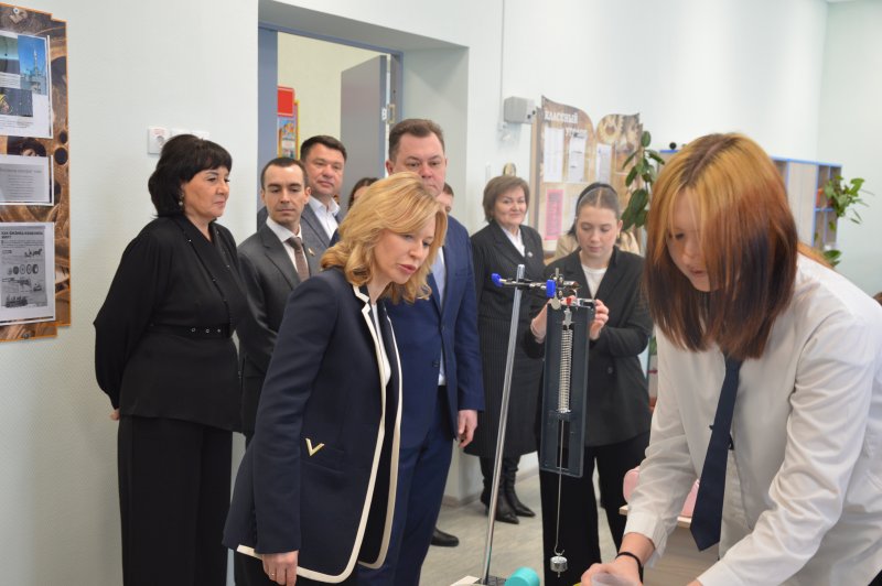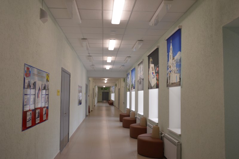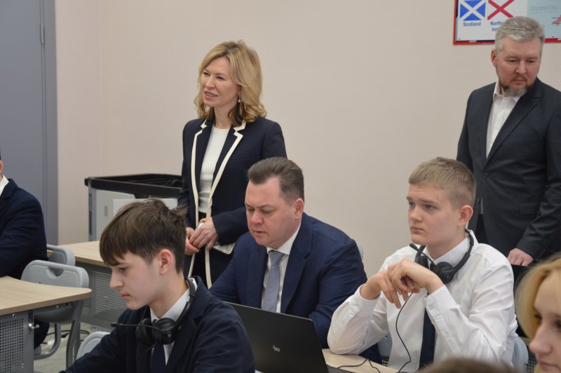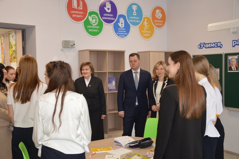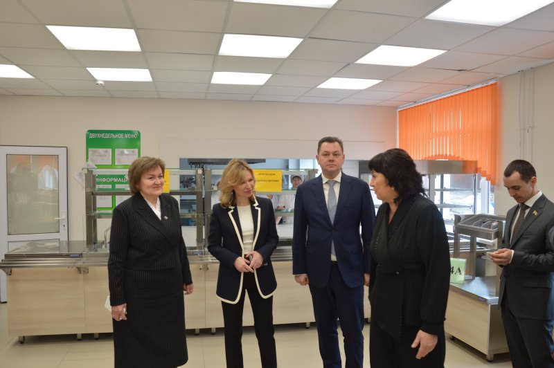 Директор образовательного учреждения Людмила Демина провела экскурсию по обновленному зданию, продемонстрировав музей, кабинет физики и лингафонный английского языка, оборудованные современной техникой, спортивный зал, танцевальный класс, центр детских инициатив, школьное кафе и актовый зал.
