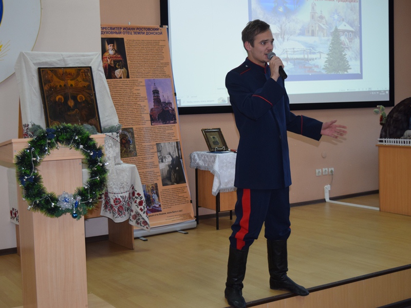 Во время мероприятия члены научного студенческого кружка «Православный восток» кафедры православной культуры и теологии ИСОИП (филиала) ДГТУ представили свои доклады на тему праздничных традиций, связанных с Рождеством. Присутствующие смогли узнать о казачий традициях Рождества и святок, а также насладиться выступлением Муниципального ансамбля песни и пляски «Надежда» под руководством заслуженного работника культуры РСФСР Надежды Петровны Тихоновой.