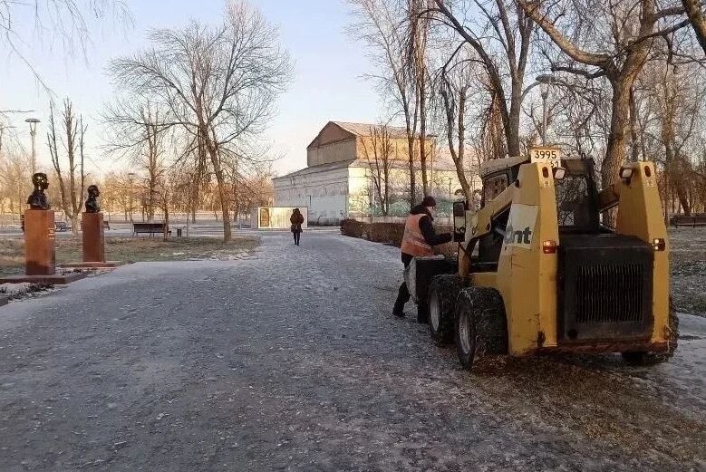Механизированная уборка включала сгребание наледи с применением противогололедных материалов.