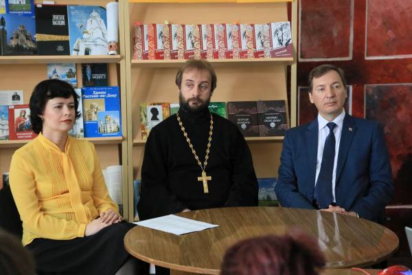 По приглашению руководства центральной городской библиотеки имени А.С. Пушкина г. Шахты председатель епархиального отдела религиозного образования и катехизации, благочинный Александровск-Грушевского округа протоиерей Сергий Яценко и древлехранитель Шахтинской епархии, старший преподаватель Института сферы обслуживания и предпринимательства (филиала) ДГТУ в г. Шахты, действительный член Императорского Православного Палестинского Общества Илья Шарков приняли участие в просветительском мероприятии “Святыни Дона”.