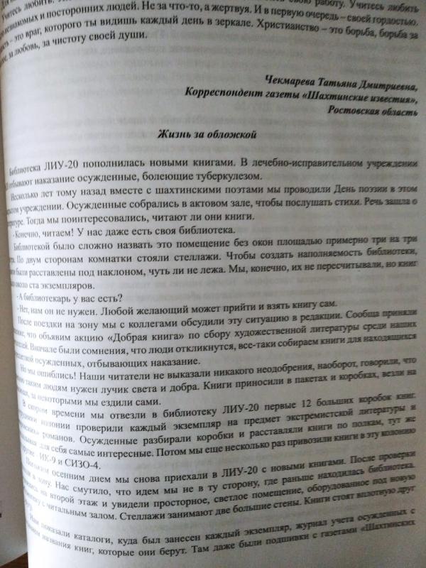 По итогам конкурса материалы Татьяны Чекмаревой «Жизнь за обложкой» и «Чтобы в жизни столь убогой Бог помог найти дорогу» вошли в сборник лучших работ. Обе работы были написаны в рамках благотворительной акции «Шахтинских известий» «Добрая книга» по сбору и передачи незащищенным слоям населения (в исправительные колонии, дома престарелых и т.д.) разножанровой литературы, которую дарят проекту наши читатели.
